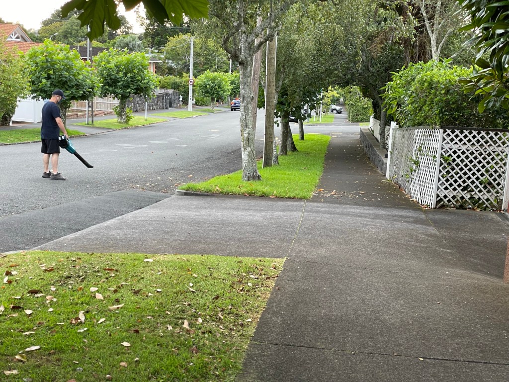 På väg till skolan passerar vi ett hus där en man var och varannan morgon går med en elektrisk lövblås och föser ihop blad som sedan gårdagen fallit ner över hans plätt.