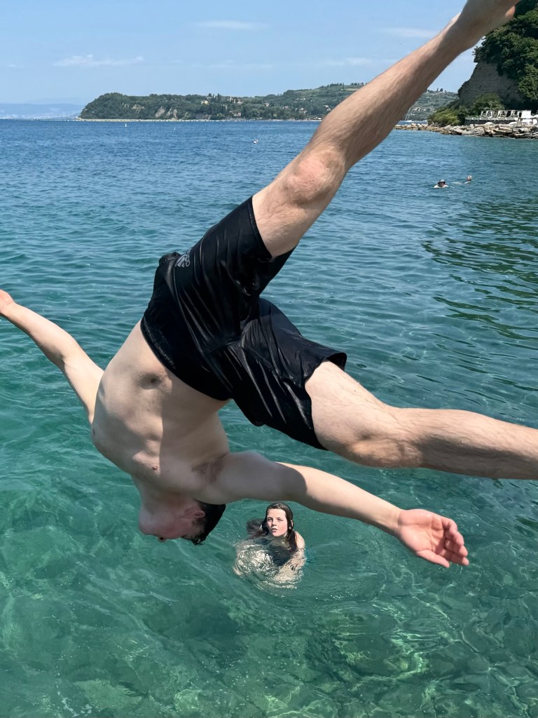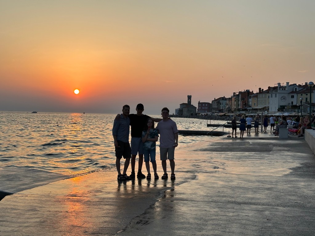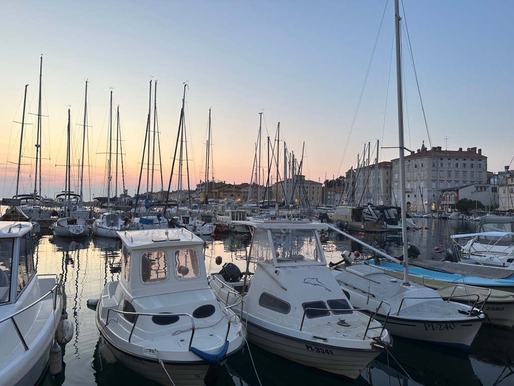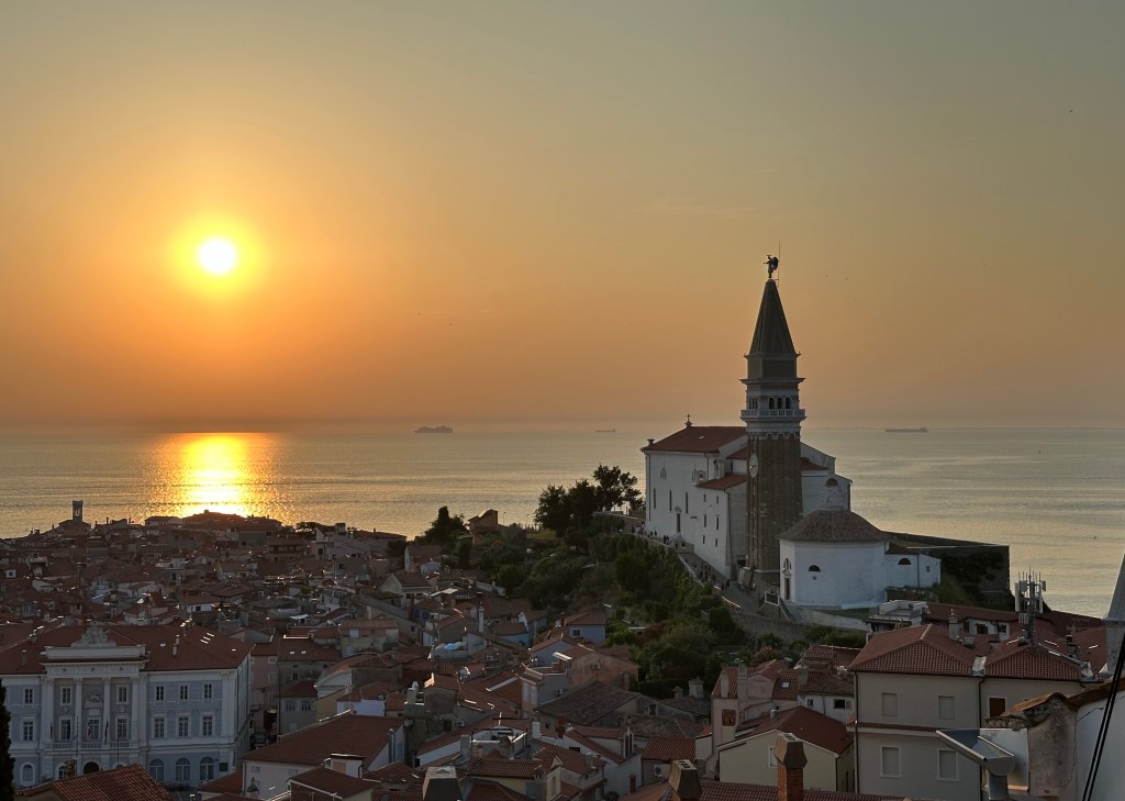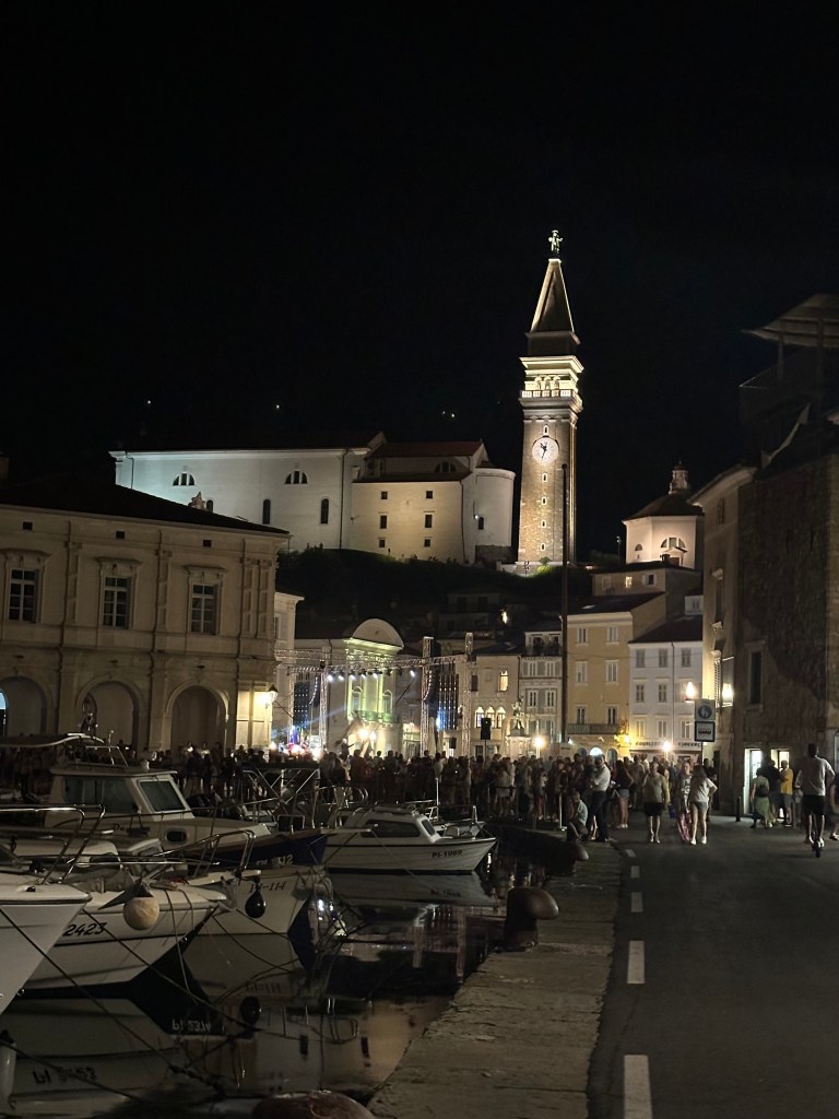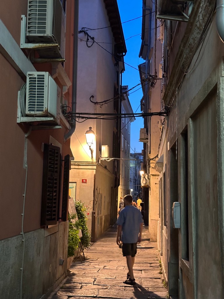 Slovenien har en kort kuststräcka, mindre än fem mil. Vi vi hittade en lägenhet i Portoroz med gångavstånd till Piran, de två städerna smälter samman. Det var upp mot 35 grader varmt på dagarna. Lite väl svettigt kanske men om man inte behöver prestera mer än att bada och äta glass är det ju ändå ok. Kusten är kuperad och husen klänger på de branta klipporna som reser sig ur havet. I Pirans gamla stadskärna är gränderna trånga och uteserveringarna många. Fint att strosa runt i skymningen när det blivit lite svalare.