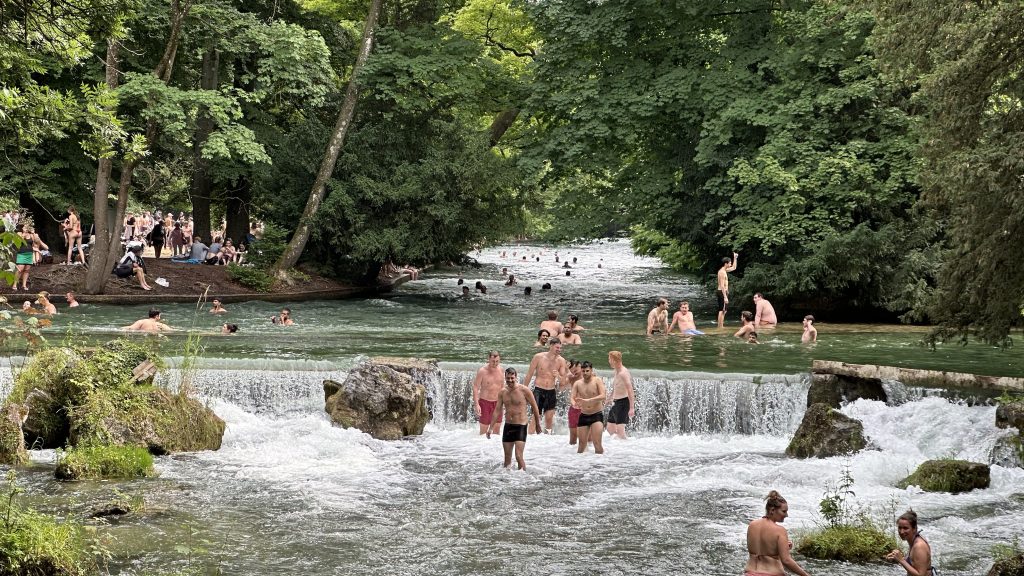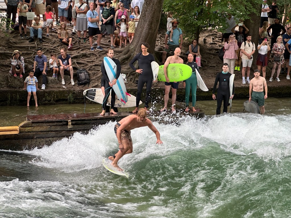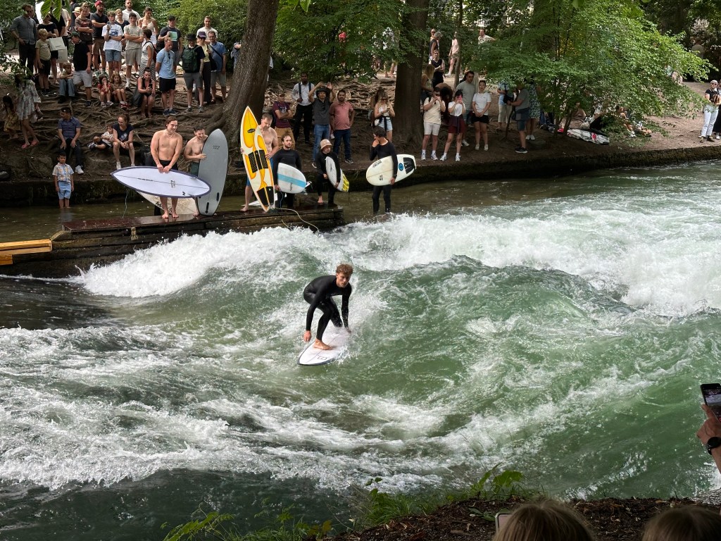 Nadine tog oss bland annat till Englischen Garten (en stor park mitt i staden) där floden Eisbach rinner igenom. Strax efter en bro bildades en naturlig konstant våg, ett surfarmecka mitt i city. Folk i våtdräkt stod i rad för att få en chans att imponera på folkmassorna runt omkring. Vi surfade inte men killarna tyckte det var kul att flyta nedströms i floden.